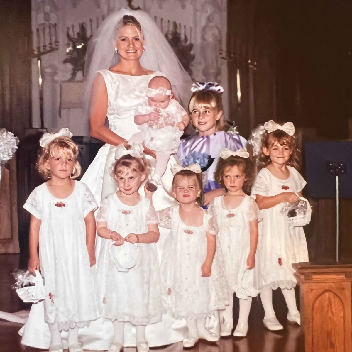 My wedding day in 1997—a cherished memory captured at the altar, surrounded by all seven of my flower girls. I have always been captivated by the timeless tradition of being a flower girl. The moment the flower girl makes her way down the aisle stands as a moving reminder of the swift passage of time and how rapidly our little girls grow up, eventually becoming brides themselves.